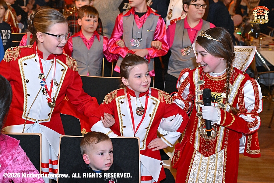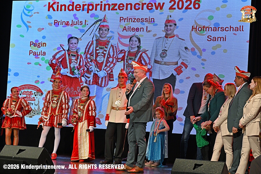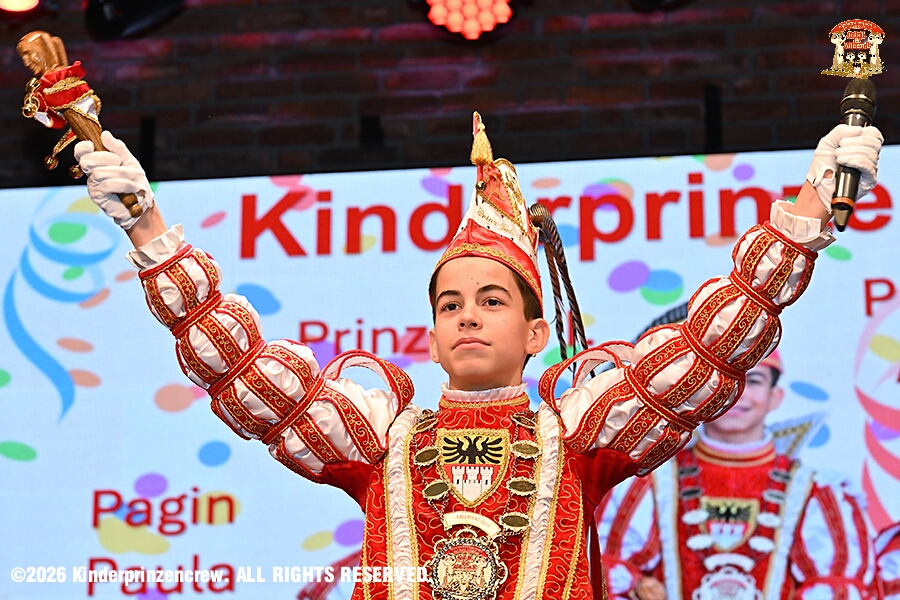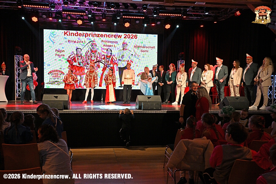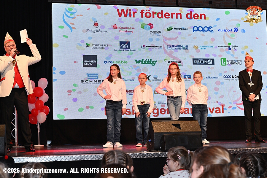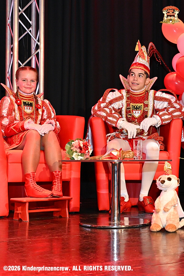 119 Unsere Kürung - Premiere - Im so genannten „Gürzenich“ von Duisburg, dem Steinhof in Huckingen fand am Sonntag, 4. Januar 2026, zum ersten Mal die Kürung einer Kinderprinzencrew statt. Wir sind nun als Prinz Juls I., Prinzessin Aileen I. mit Hofmarschall Sami und Pagin Paula der Stadt Duisburg 2026 inthronisiert.