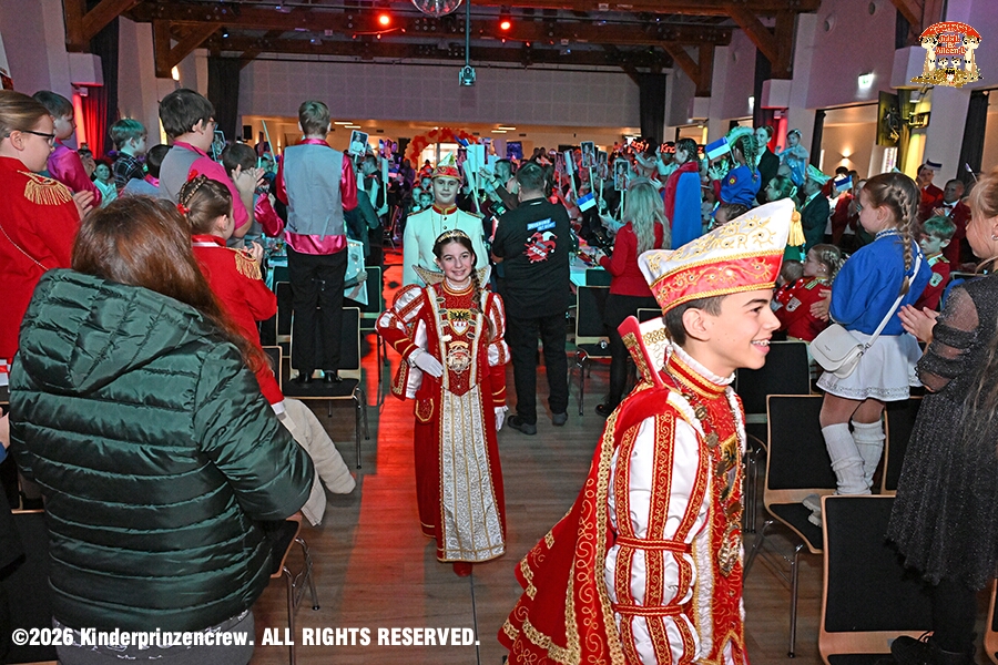 114 Unsere Kürung - Premiere - Im so genannten „Gürzenich“ von Duisburg, dem Steinhof in Huckingen fand am Sonntag, 4. Januar 2026, zum ersten Mal die Kürung einer Kinderprinzencrew statt. Wir sind nun als Prinz Juls I., Prinzessin Aileen I. mit Hofmarschall Sami und Pagin Paula der Stadt Duisburg 2026 inthronisiert.