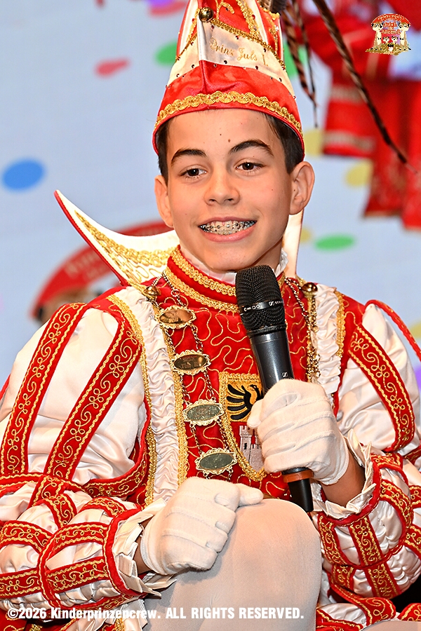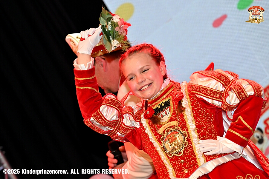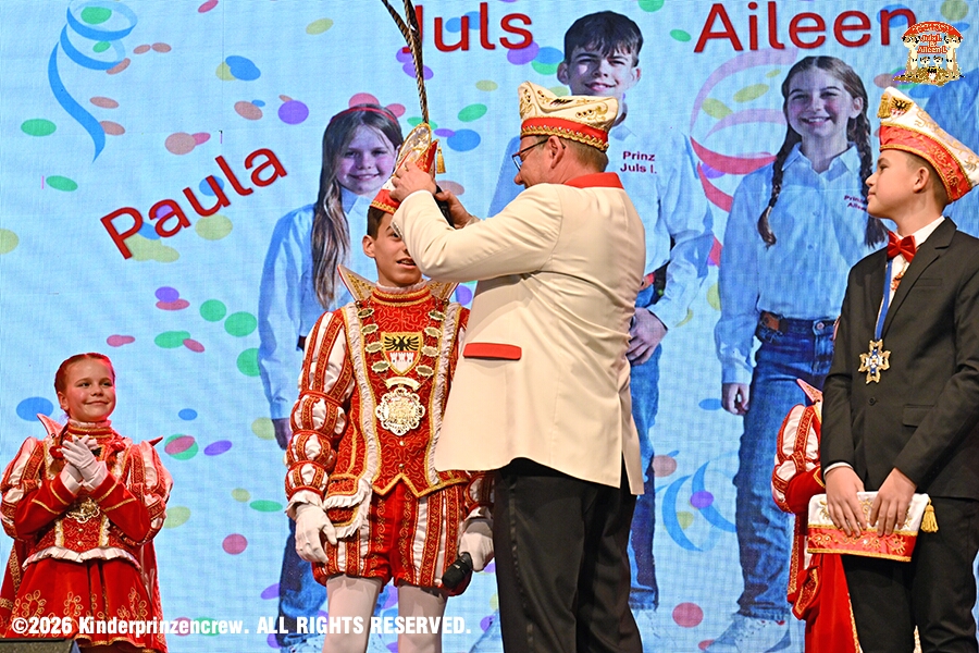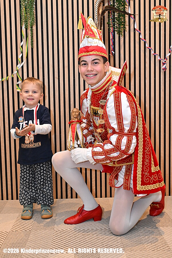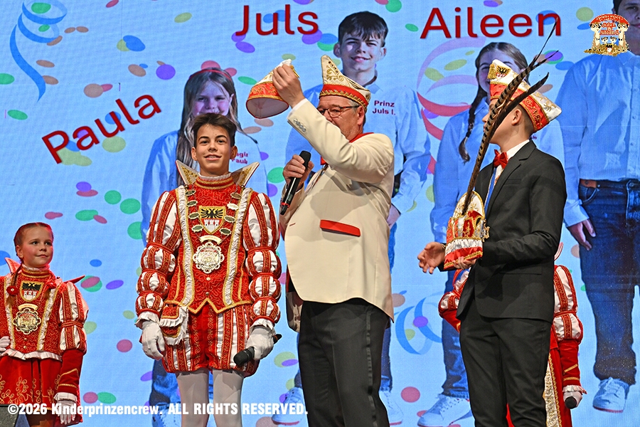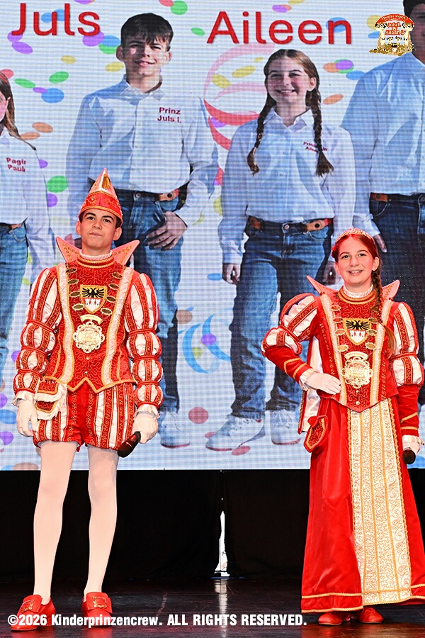 9 Unsere Kürung - Premiere - Im so genannten „Gürzenich“ von Duisburg, dem Steinhof in Huckingen fand am Sonntag, 4. Januar 2026, zum ersten Mal die Kürung einer Kinderprinzencrew statt. Wir sind nun als Prinz Juls I., Prinzessin Aileen I. mit Hofmarschall Sami und Pagin Paula der Stadt Duisburg 2026 inthronisiert.