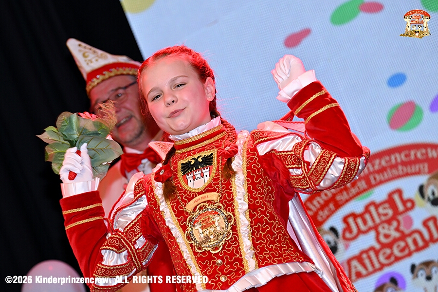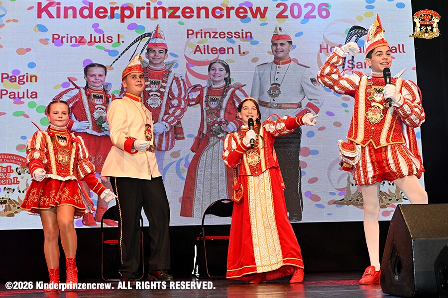 121 Unsere Kürung - Premiere - Im so genannten „Gürzenich“ von Duisburg, dem Steinhof in Huckingen fand am Sonntag, 4. Januar 2026, zum ersten Mal die Kürung einer Kinderprinzencrew statt. Wir sind nun als Prinz Juls I., Prinzessin Aileen I. mit Hofmarschall Sami und Pagin Paula der Stadt Duisburg 2026 inthronisiert.