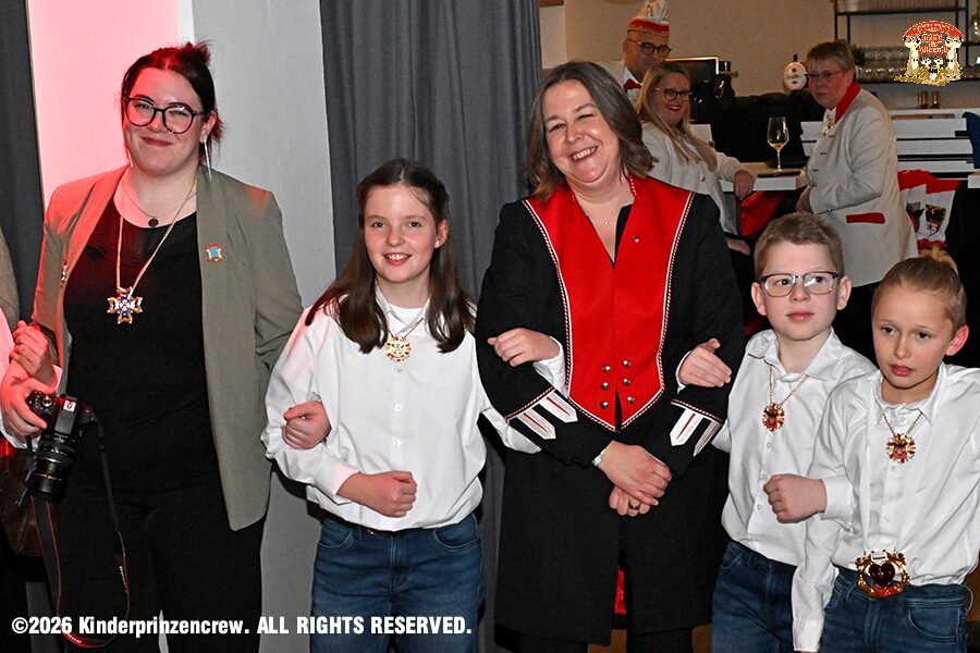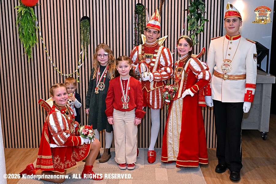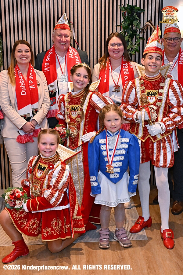 76 Unsere Kürung - Premiere - Im so genannten „Gürzenich“ von Duisburg, dem Steinhof in Huckingen fand am Sonntag, 4. Januar 2026, zum ersten Mal die Kürung einer Kinderprinzencrew statt. Wir sind nun als Prinz Juls I., Prinzessin Aileen I. mit Hofmarschall Sami und Pagin Paula der Stadt Duisburg 2026 inthronisiert.