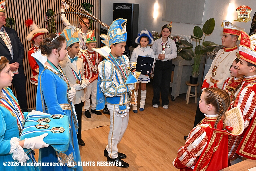 73 Unsere Kürung - Premiere - Im so genannten „Gürzenich“ von Duisburg, dem Steinhof in Huckingen fand am Sonntag, 4. Januar 2026, zum ersten Mal die Kürung einer Kinderprinzencrew statt. Wir sind nun als Prinz Juls I., Prinzessin Aileen I. mit Hofmarschall Sami und Pagin Paula der Stadt Duisburg 2026 inthronisiert.