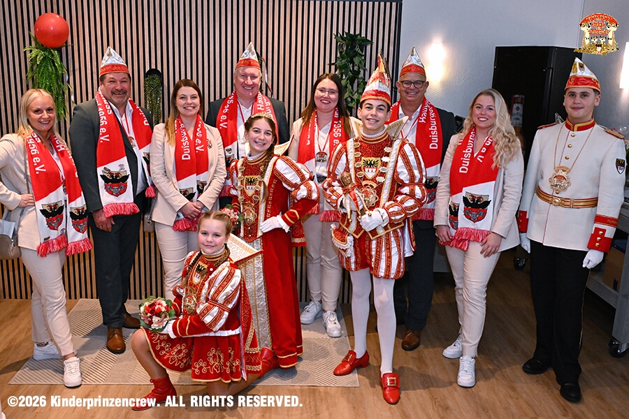 99 Unsere Kürung - Premiere - Im so genannten „Gürzenich“ von Duisburg, dem Steinhof in Huckingen fand am Sonntag, 4. Januar 2026, zum ersten Mal die Kürung einer Kinderprinzencrew statt. Wir sind nun als Prinz Juls I., Prinzessin Aileen I. mit Hofmarschall Sami und Pagin Paula der Stadt Duisburg 2026 inthronisiert.