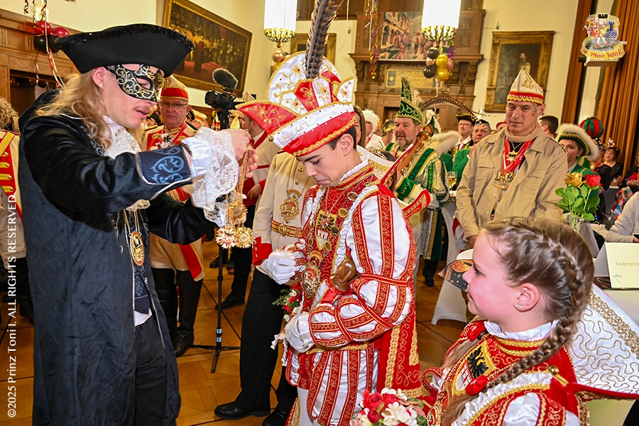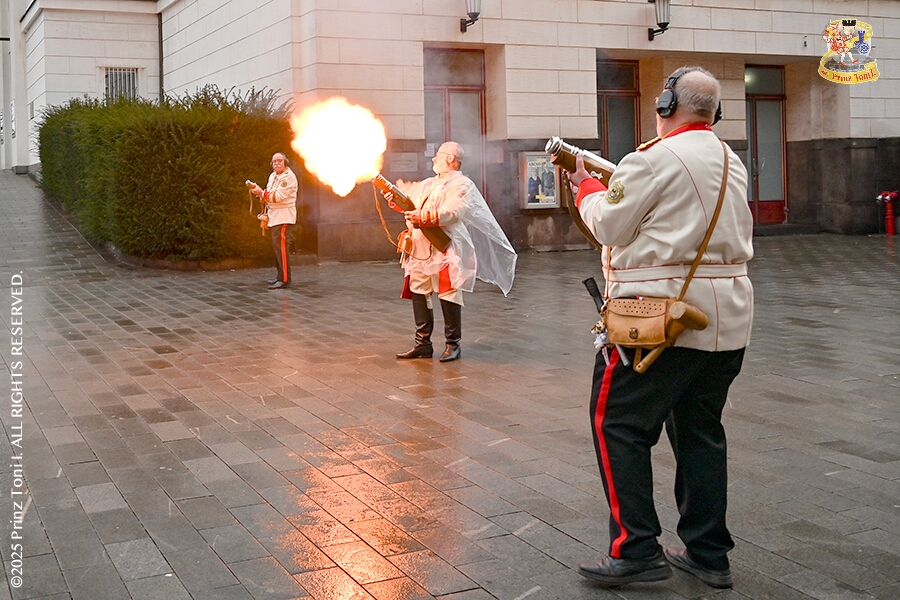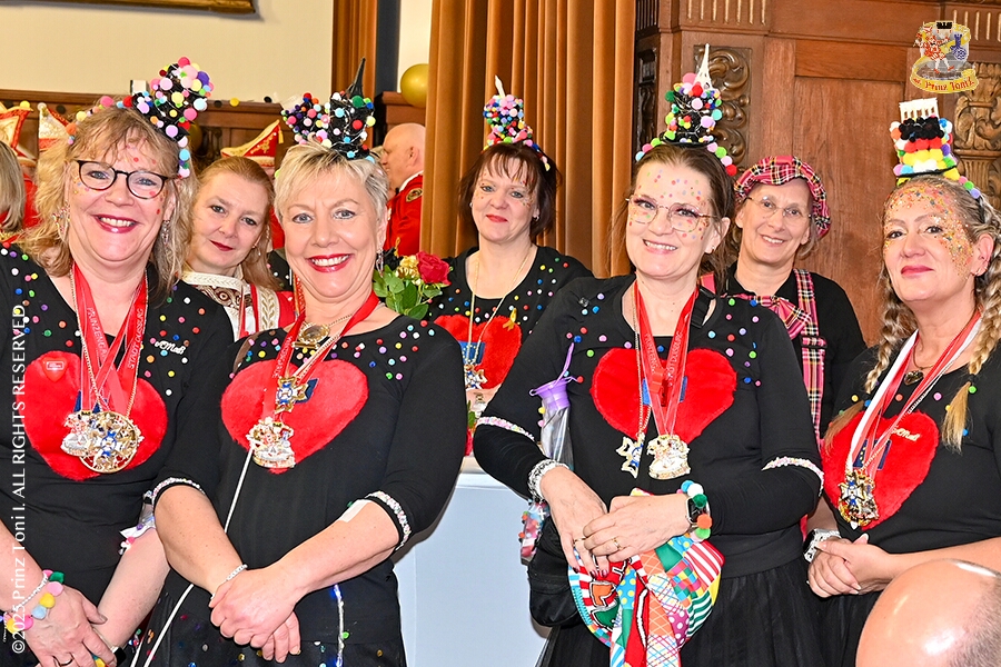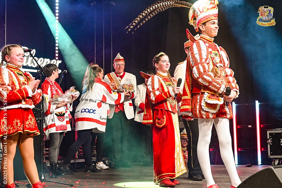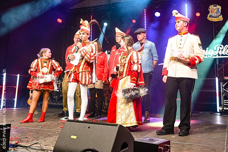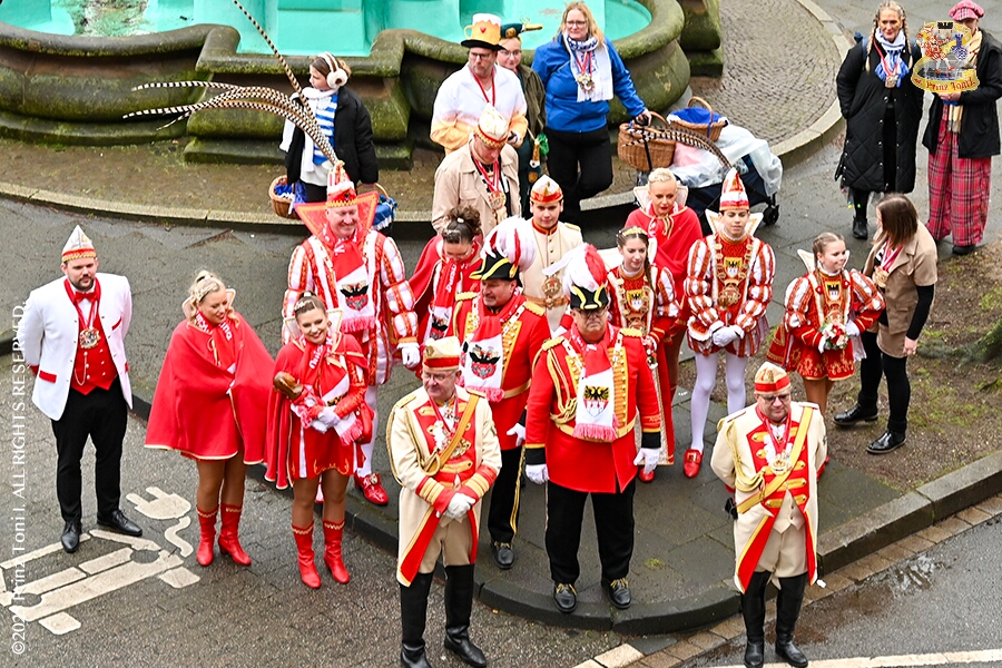 24 Rosenmontag 2026 - Es war eigentlich ein toller Tag, wenn nur das Wetter mitgespielt hätte. Beim Wecken von Prinz Toni I. vor dem WYNDHAM Hotel Duisburger Hof war es schon recht ungemütlich. Danach dann ein paar warme Stunden in unserem Rat, beim Prinzenwecken mit OB Sören Link. Pünktlich zum Start des Rosenmontagszugs geht es los mit dem Regen, bis auf kurze Momente hielt er an bis zum Ende des Zuges. Nachdem sich Alle im König Pilsener Festzelt auf gewärmt hatten, kamen auf der Bühne die Verabschiedung von uns, der Kinderprinzencrew 2026, und Prinz Toni I.