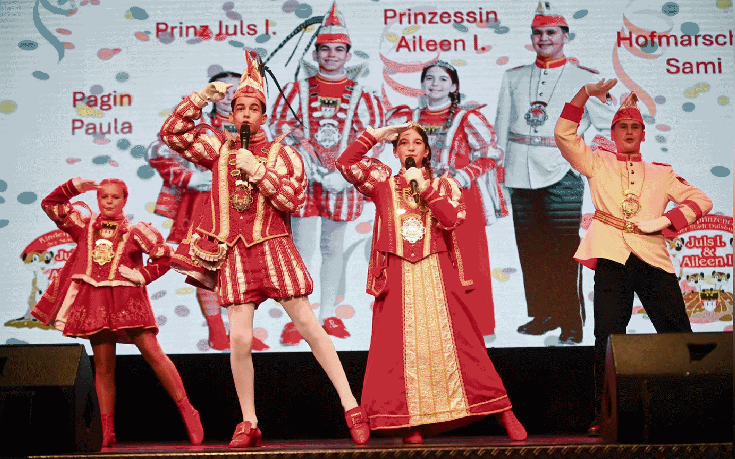 Der Jubel war geradezu ohrenbetäubend. Mit frenetischem Beifall, Schreien und Trillerpfeifen feierten mehr als 400 Menschen am Sonntagnachmittag vier neue Stars des Duisburger Karnevals. Im Huckinger Steinhof wurden Prinz Yuls I. Grothuysen, Prinzessin Aileen I. Lyx, Hofmarschall Sami Belaheen (alle 12) und Pagin Paula Rühl (11) in ihr Amt als oberste Repräsentanten des närrischen Nachwuchses für die Session 2026 eingeführt. Bei ihrer Kürung bewies die neue Kinderprinzen-Crew mitreißenden Charme und viel Talent.