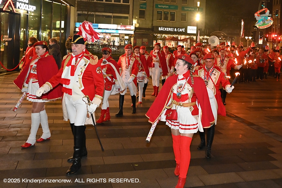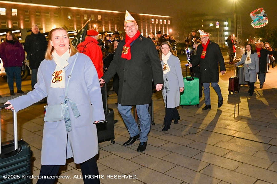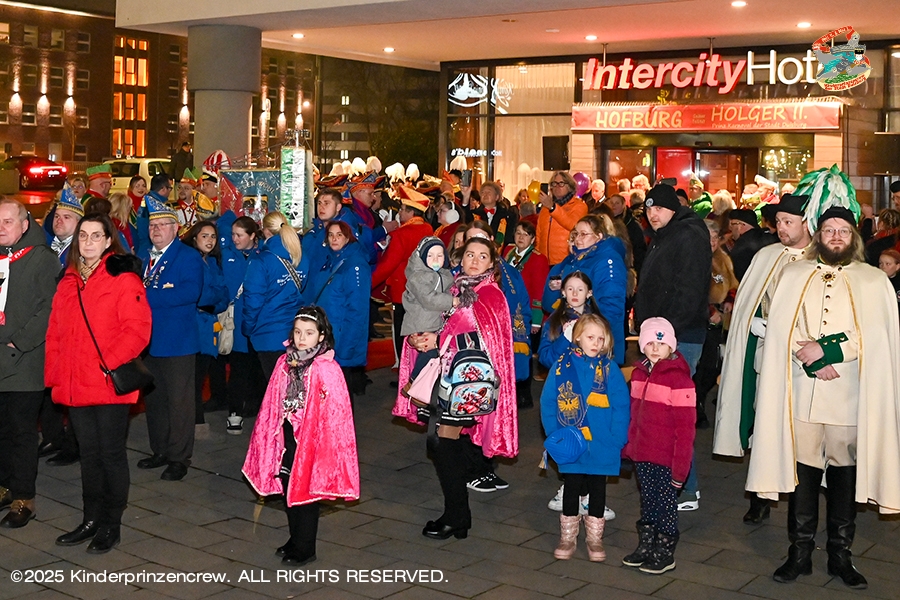11 Einzug in die Hofburg - Ein kühler Freitag Abend erwartet uns vor der Tür des IntercitsHotel bei der Begrüßung der anwesenden Gesellschaften und der Fahnenhissung se. Tollität Prinz Holger 2ten. Danach zog die Prinzencrew 2025 in ihre „Hofburg“.
