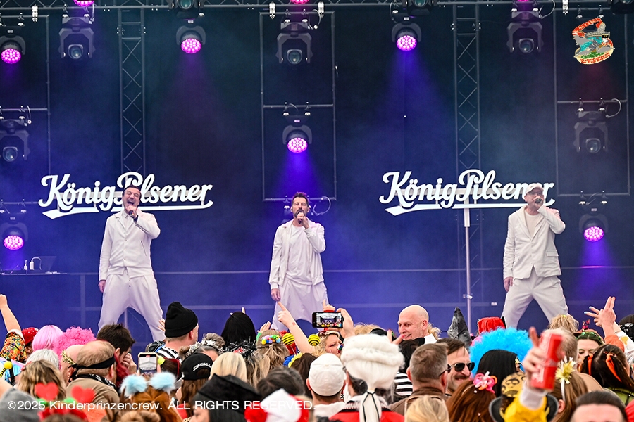 99 Weiberfastnacht 2025 - ein Ausschnitt - Es beginnt mit dem Rathaussturm im Festzelt des HDK auf dem Festplatz „Am Güterbahnhof“. Pure Party-Stimmung im vollen Zelt um 11:11 Uhr. Der Tag ist voller Termine, einer davon ist am späten Nachmittag bei der 1. KG Baerl, bei „Freya“, mit der deren Altweiber-Party. Diese gibt es dann auch zwei Termin weiter, der letzte Termin dann im Süden bei der KG Alle Mann an Bord den „Blauen Jungs“. Auch hier wie überall an diesem Tag ein volles Haus.