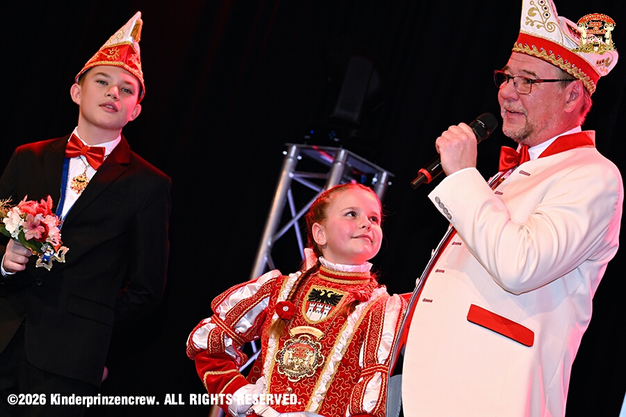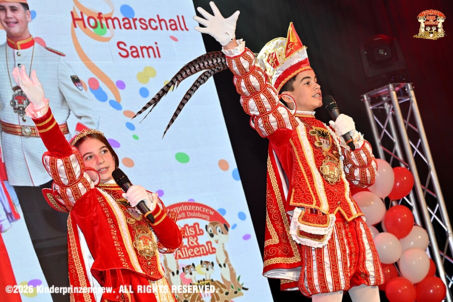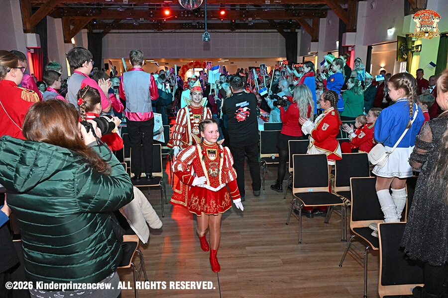 119 Unsere Kürung - Premiere - Im so genannten „Gürzenich“ von Duisburg, dem Steinhof in Huckingen fand am Sonntag, 4. Januar 2026, zum ersten Mal die Kürung einer Kinderprinzencrew statt. Wir sind nun als Prinz Juls I., Prinzessin Aileen I. mit Hofmarschall Sami und Pagin Paula der Stadt Duisburg 2026 inthronisiert.