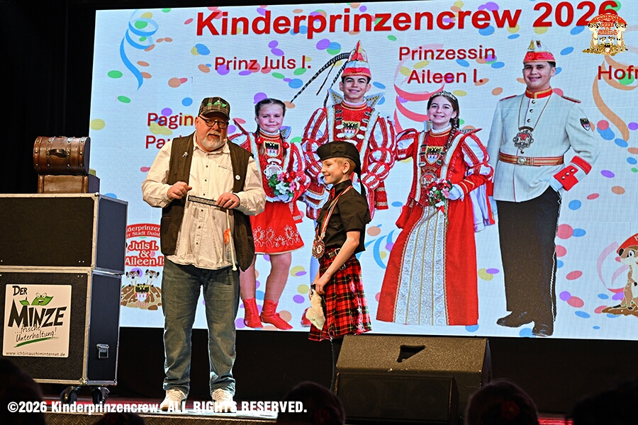 9 Unsere Kürung - Premiere - Im so genannten „Gürzenich“ von Duisburg, dem Steinhof in Huckingen fand am Sonntag, 4. Januar 2026, zum ersten Mal die Kürung einer Kinderprinzencrew statt. Wir sind nun als Prinz Juls I., Prinzessin Aileen I. mit Hofmarschall Sami und Pagin Paula der Stadt Duisburg 2026 inthronisiert.