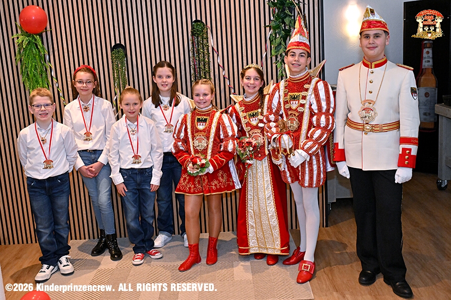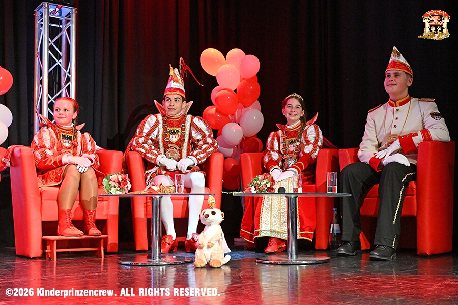 124 Unsere Kürung - Premiere - Im so genannten „Gürzenich“ von Duisburg, dem Steinhof in Huckingen fand am Sonntag, 4. Januar 2026, zum ersten Mal die Kürung einer Kinderprinzencrew statt. Wir sind nun als Prinz Juls I., Prinzessin Aileen I. mit Hofmarschall Sami und Pagin Paula der Stadt Duisburg 2026 inthronisiert.