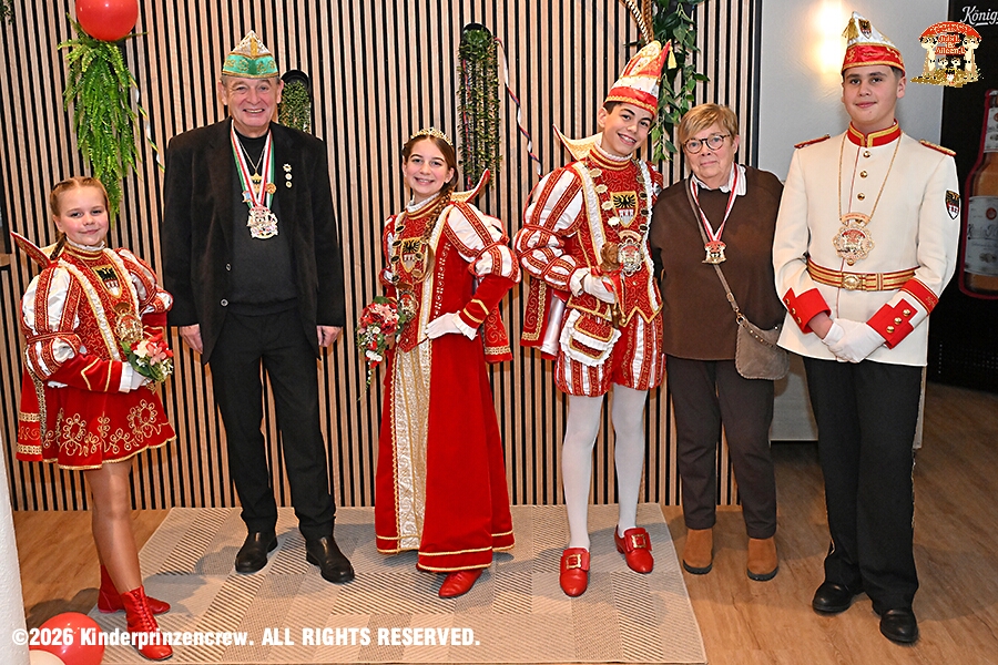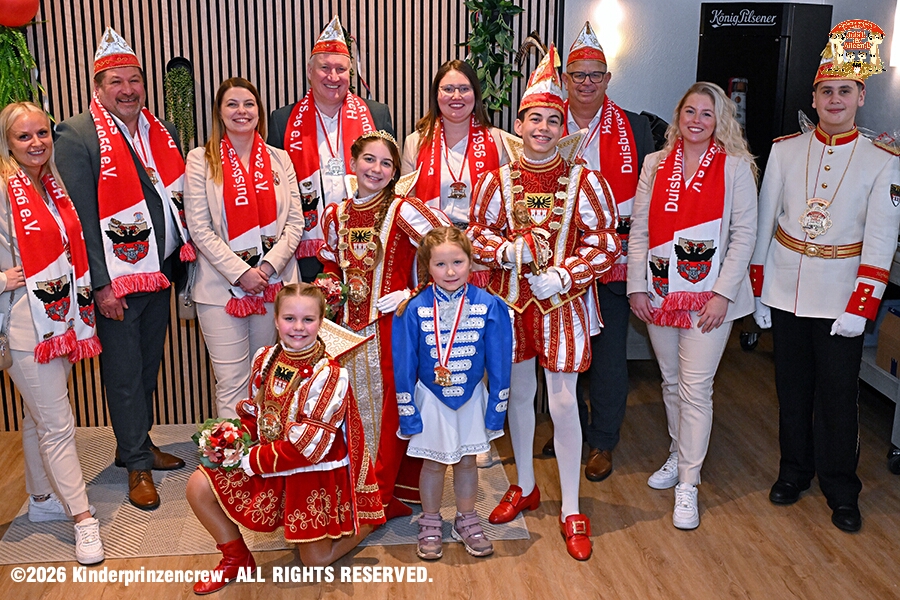 76 Unsere Kürung - Premiere - Im so genannten „Gürzenich“ von Duisburg, dem Steinhof in Huckingen fand am Sonntag, 4. Januar 2026, zum ersten Mal die Kürung einer Kinderprinzencrew statt. Wir sind nun als Prinz Juls I., Prinzessin Aileen I. mit Hofmarschall Sami und Pagin Paula der Stadt Duisburg 2026 inthronisiert.