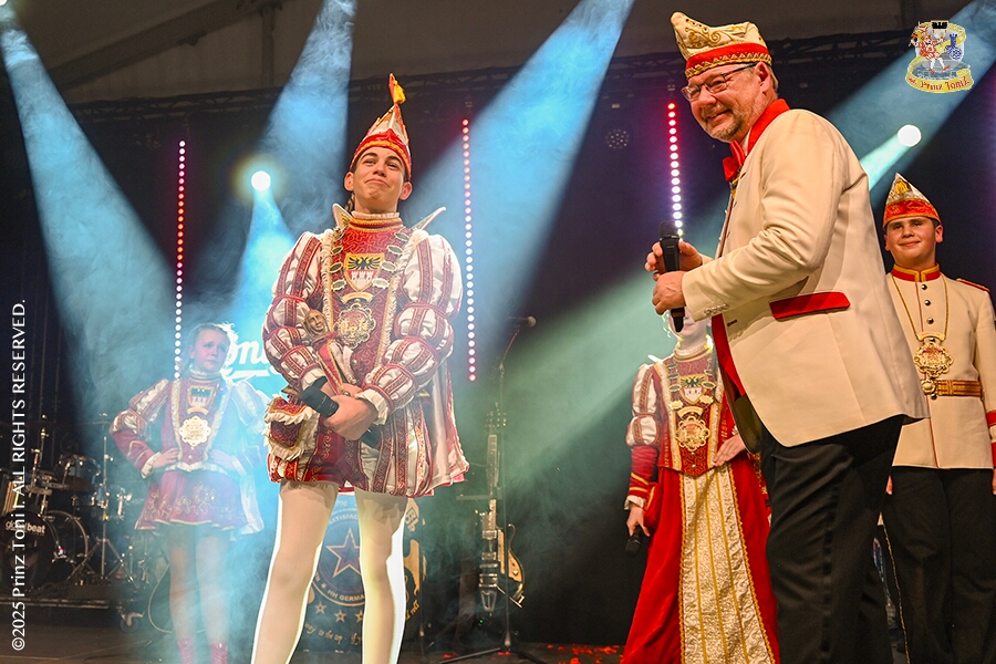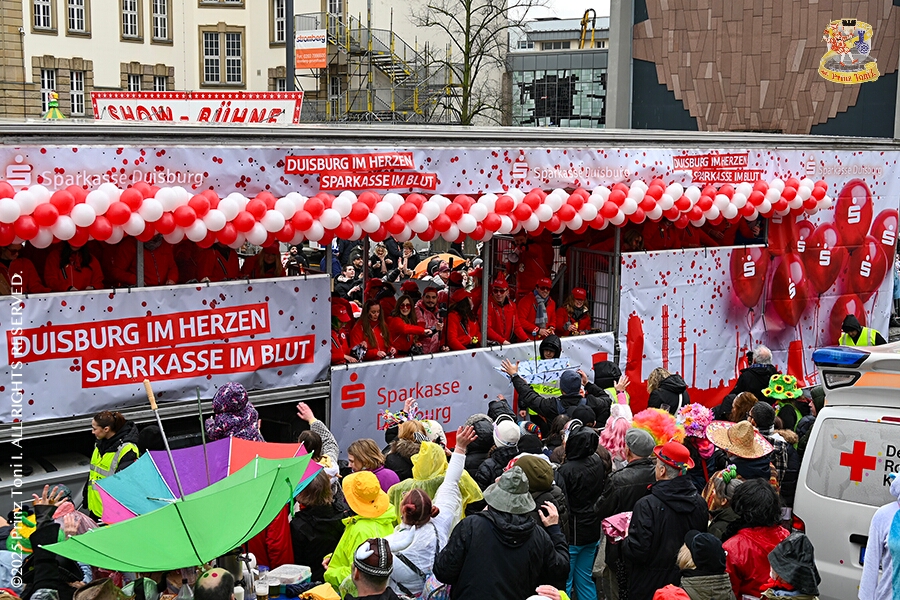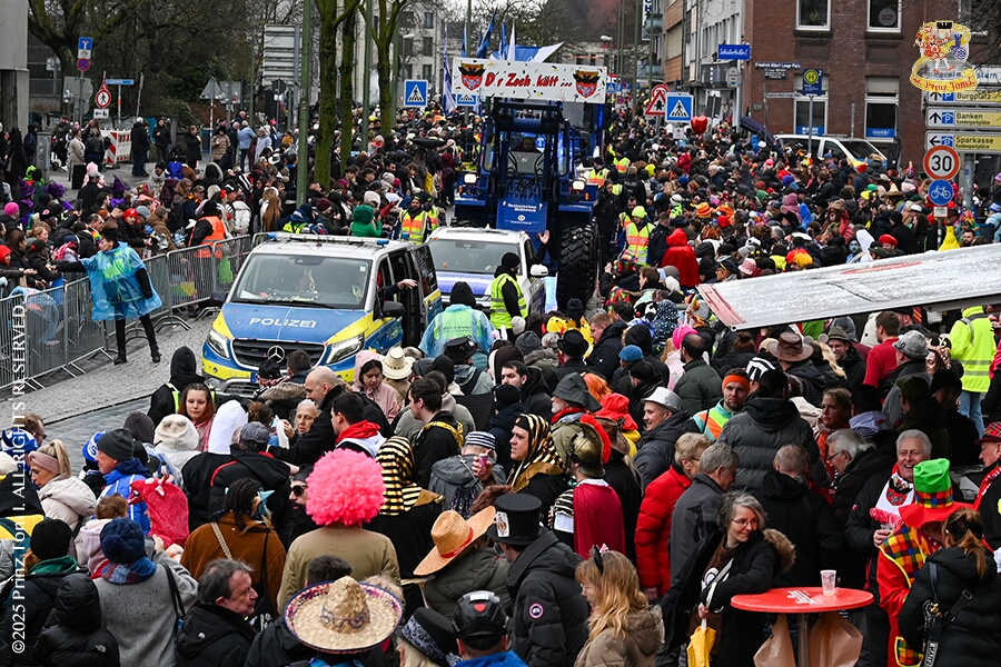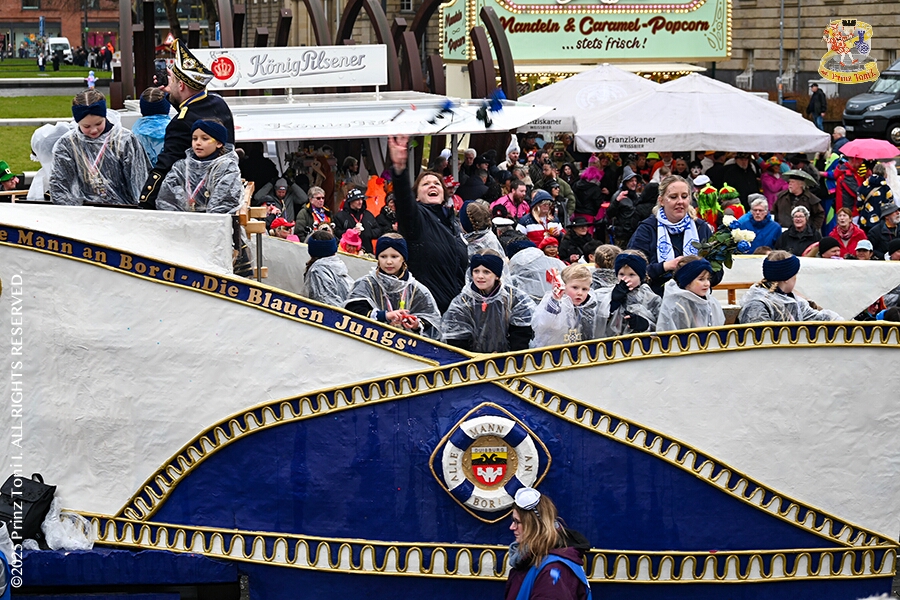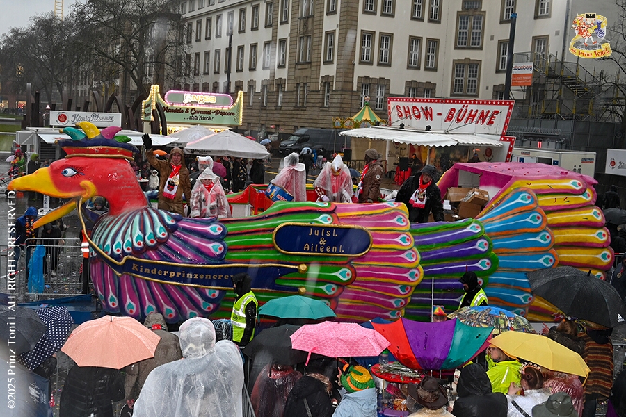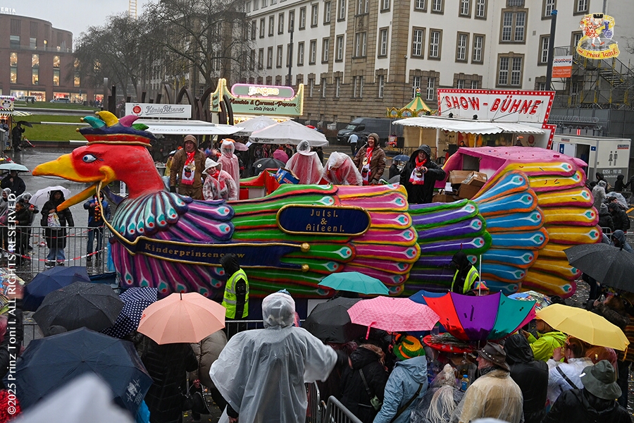 50 Rosenmontag 2026 - Es war eigentlich ein toller Tag, wenn nur das Wetter mitgespielt hätte. Beim Wecken von Prinz Toni I. vor dem WYNDHAM Hotel Duisburger Hof war es schon recht ungemütlich. Danach dann ein paar warme Stunden in unserem Rat, beim Prinzenwecken mit OB Sören Link. Pünktlich zum Start des Rosenmontagszugs geht es los mit dem Regen, bis auf kurze Momente hielt er an bis zum Ende des Zuges. Nachdem sich Alle im König Pilsener Festzelt auf gewärmt hatten, kamen auf der Bühne die Verabschiedung von uns, der Kinderprinzencrew 2026, und Prinz Toni I.