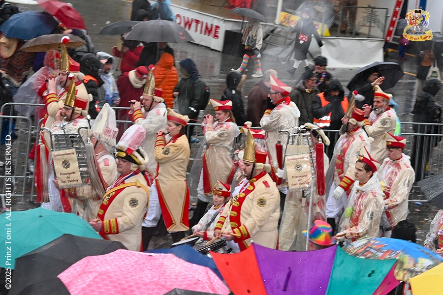 25 Rosenmontag 2026 - Es war eigentlich ein toller Tag, wenn nur das Wetter mitgespielt hätte. Beim Wecken von Prinz Toni I. vor dem WYNDHAM Hotel Duisburger Hof war es schon recht ungemütlich. Danach dann ein paar warme Stunden in unserem Rat, beim Prinzenwecken mit OB Sören Link. Pünktlich zum Start des Rosenmontagszugs geht es los mit dem Regen, bis auf kurze Momente hielt er an bis zum Ende des Zuges. Nachdem sich Alle im König Pilsener Festzelt auf gewärmt hatten, kamen auf der Bühne die Verabschiedung von uns, der Kinderprinzencrew 2026, und Prinz Toni I.