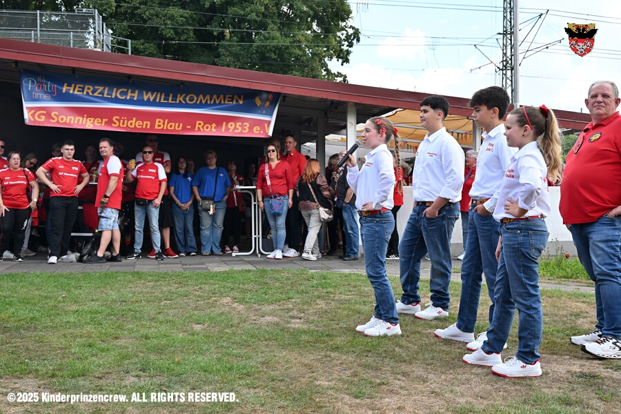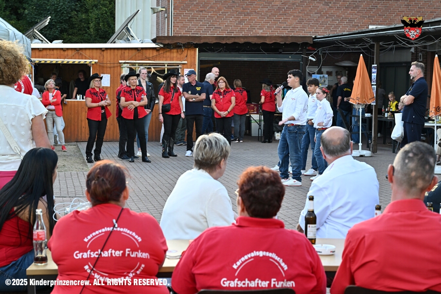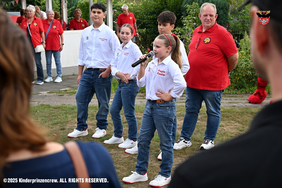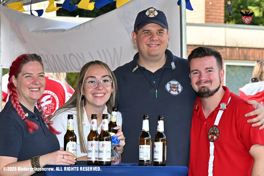 Gleich vier Sommerfeste standen auf dem Programm. Begonnen haben wir im Süden Duisburgs, natürlich bei der KG Sonniger-Süden. Dort starteten wir auch endlich mit dem Verkauf unserer Pins. Das nächste Ziel lag in Meiderich, das „Garde-Grillen“ der Duisburger Prinzengarde. Ein kurzer Besuch beim Kinderfest der KG Rote Funken lag auf dem Weg in den Westen Duisburgs zur 1. KG Baerl.