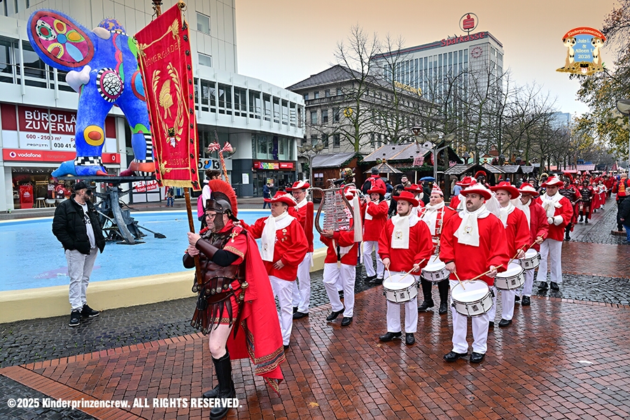 85 Auftakt HDK, Proklamation, Auftaktsitzung - Samstag, 15. November, zogen wir mit den Duisburger Karnevalsgesellschaften vom Forum über die Königsstraße zum Burgplatz. Hier war dann die Auftaktveranstaltung des HDK. Um die Mittagszeit sind es über den Rhein nach Kamp-Lintfort gefahren, dort war in der Stadthalle die Proklamation von der Jugendprinzessin Sophie I. Am frühen Abend dann in die Aula, unsere Aula, vom Reinhard-und-Max-Mannesmann-Gymnasium, zur Auftaktsitzung unseres „Heimathafens“. Mit „stürmischer“ Begeisterung wurden wir dort empfangen.