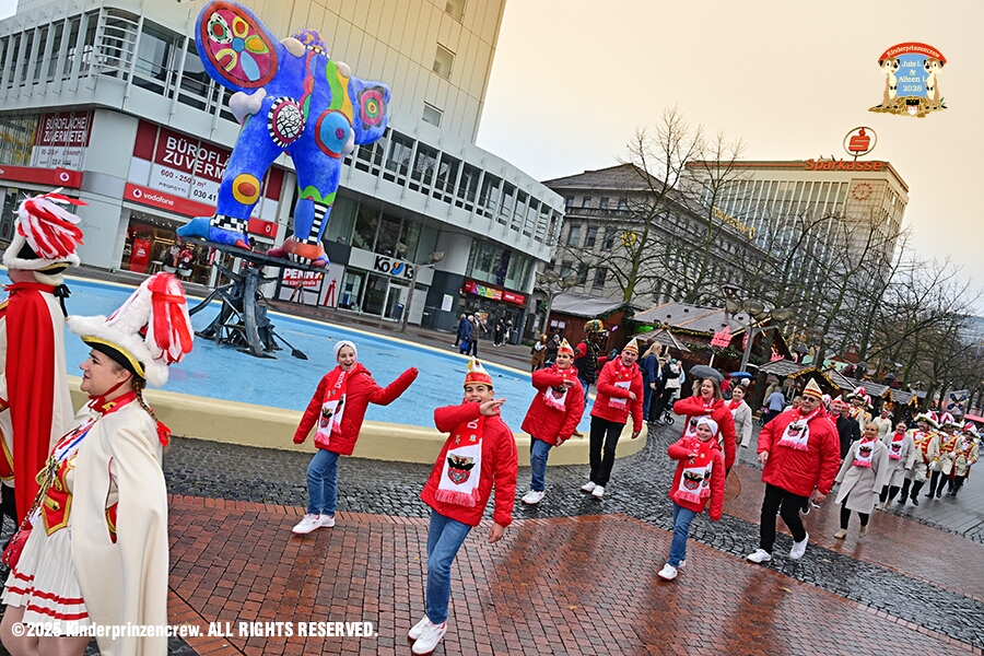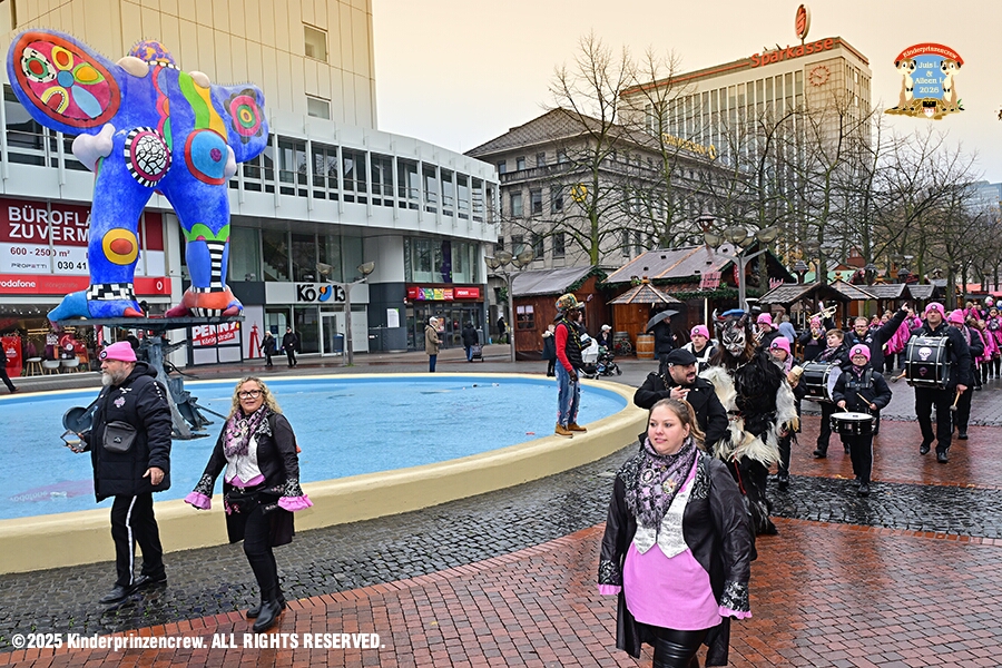 106 Auftakt HDK, Proklamation, Auftaktsitzung - Samstag, 15. November, zogen wir mit den Duisburger Karnevalsgesellschaften vom Forum über die Königsstraße zum Burgplatz. Hier war dann die Auftaktveranstaltung des HDK. Um die Mittagszeit sind es über den Rhein nach Kamp-Lintfort gefahren, dort war in der Stadthalle die Proklamation von der Jugendprinzessin Sophie I. Am frühen Abend dann in die Aula, unsere Aula, vom Reinhard-und-Max-Mannesmann-Gymnasium, zur Auftaktsitzung unseres „Heimathafens“. Mit „stürmischer“ Begeisterung wurden wir dort empfangen.
